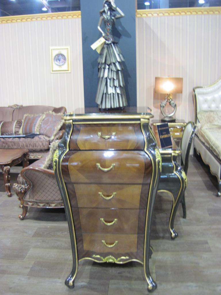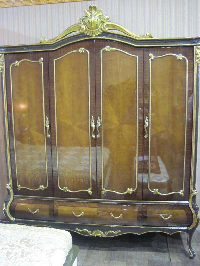 7. Шкаф 4-х дверный выделяется вместительной конструкцией. В нижней части расположены 4 выдвижных ящика с полукруглой фурнитурой. Лакированные фасады выполнены в технике инкрустации, которая придаёт готовому изделию оригинальный внешний вид. В верхней и нижней части шкафа расположен декоративный элемент в классическом стиле. Габариты: 1920*610*2310.