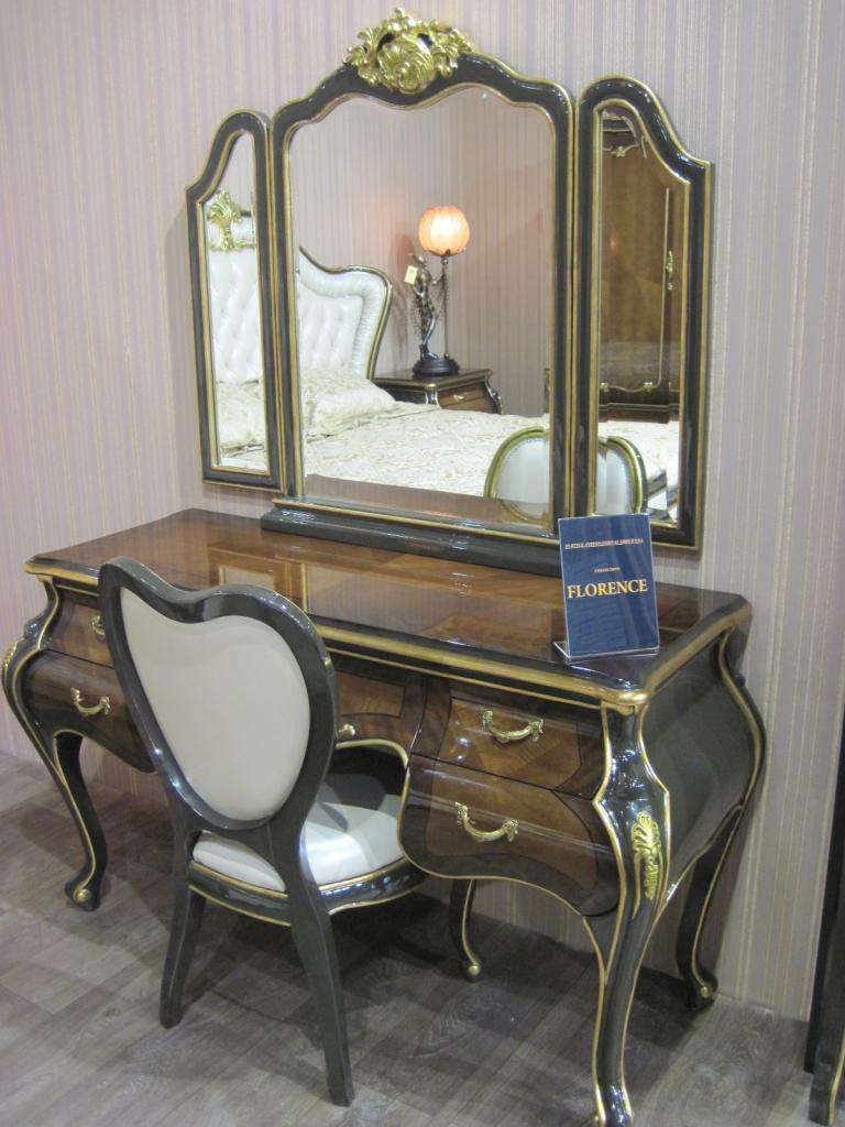 4. Зеркало повысит функциональность макияжной зоны. Состоит из основной части и боковых створок, поэтому удобно в эксплуатации. Деревянная рама по краям покрыта золотом, а в центре её украшает резной декор. Габариты: 1200*70*1050.