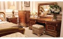 3. Стол туалетный выделяется массивной и симметричной конструкцией. Состоит из выдвижных ящиков, украшенных кнопочной золотой фурнитурой. В комплекте с прямоугольным зеркалом столик создаст гармоничную композицию. Габариты: 1850х550х760