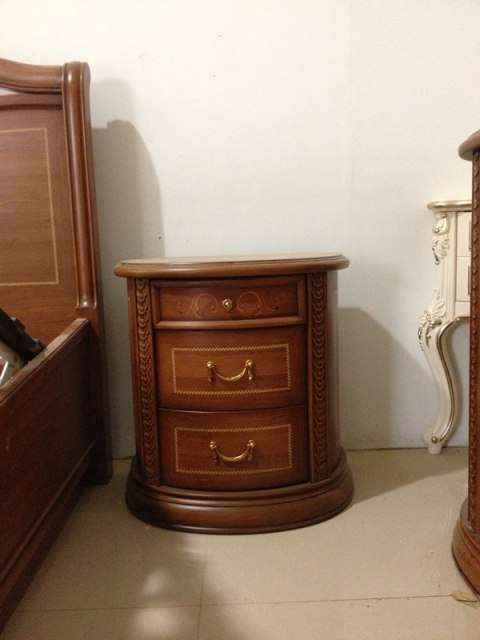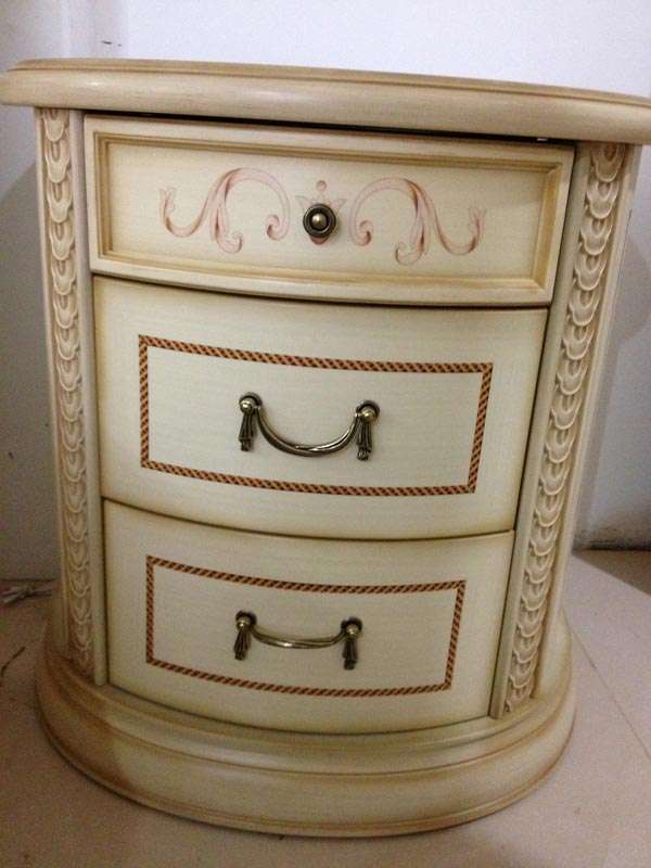 2. Прикроватная тумба имеет полукруглую конструкцию, состоит из трёх выдвижных ящиков , украшенных золотой фурнитурой. Удобная форма позволяет расположить тумбу возле стены и дополнить зону для отдыха. Размеры. 640x450x650