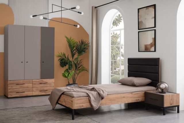 Мебель в детскую комнату Артемида. Мебель выполнена из МДФ высокого качества. Мебель сделана в комбинации цветов- натурального дерева, серого и графитового цвета. В этой коллекции есть кровать, тумбочки прикроватные, шкаф для одежды, письменный стол, книжный шкаф.