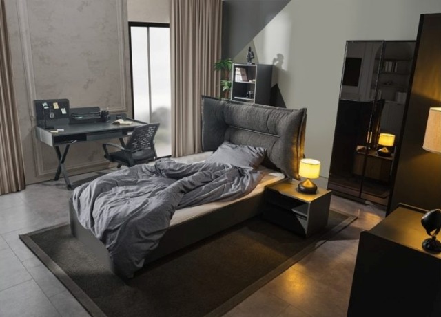 Красивая серая мебель для спальни Аура (AURA). Подростковая мебель Аура сделана в графитовом цвете в стиле модерн. Стильная кровать сделана с мягким изголовьем интересной формы. В этой коллекции Аура Вы сможете выбрать любой подходящий Вам комплект. Шкаф можно заказать как прямой так и угловой.