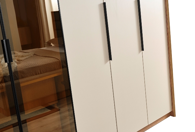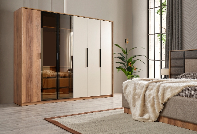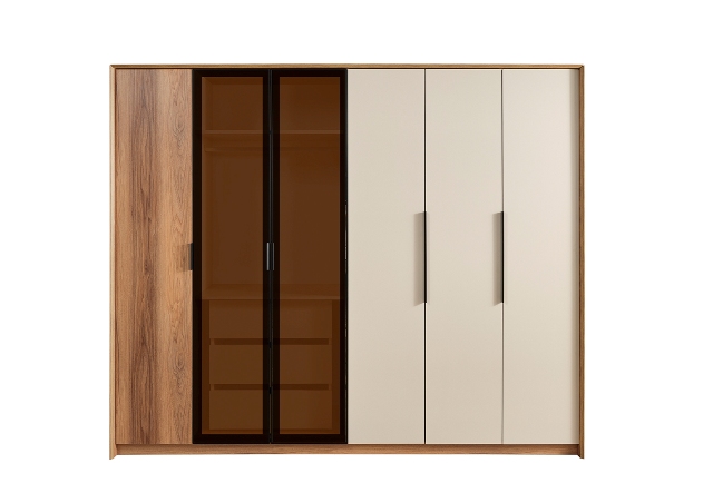 Современная мебель для спальни Азия сделана из МДФ высокого качества в комбинации белого цвета и цвета натурального дерева. В комплект спальни входит кровать с подъемным механизмом, 2 тумбочки, комод с зеркалом, шкаф 6 дверей. Мебель можно покупать полным комплектом или отдельными элементами мебели.