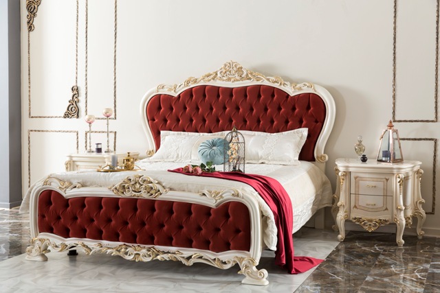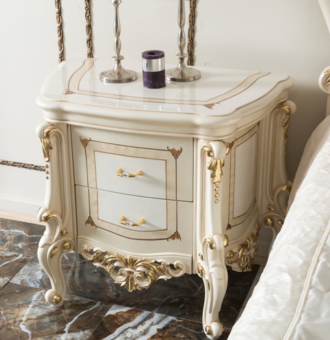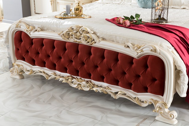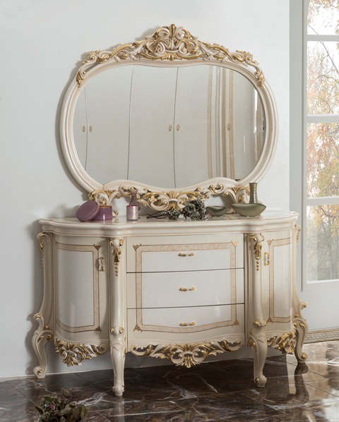 Классическую белую мебель для спальни Чириган от турецкой фабрики производителя можно купить в нашем магазине мебели в Киеве. Спальня сделана из натурального дерева и МДФ. Красивые резные узоры на мебели покрыты золотой патиной. Фасады мебели покрашены под мрамор.