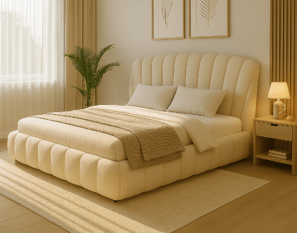 Изголовье мягкой кровати Шелл сделано в виде ракушки, что придает индивидуальности и богатства подчеркиывая интерьер как современной так и классической спальни.