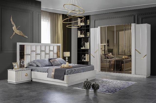 Белая спальня Астана сделана из МДФ высокого качества на турецкой фабрике. Спальню Вы можете заказать и купить в нашем магазине мебели в Киеве в полном комплекте или отдельными единицами мебели – кровать, прикроватные тумбочки, трюмо, шкаф для одежды. Шкаф полностью укомплектован местами для хранения – полки, ящики, штанги для вешалок. Кровать может быть в размерах спального места- 1600*2000 и 1800*2000 и оснащена подъемным механизмом.