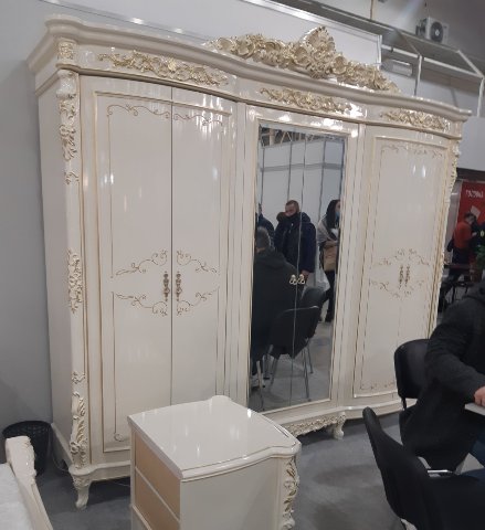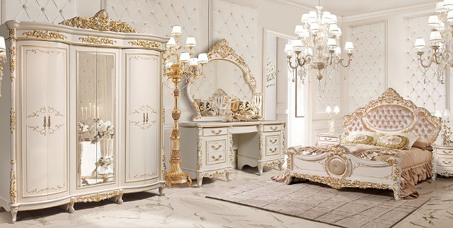 Белая классическая мебель для спальни Версаль с золотой патиной представлена в нашем магазине мебели в Киеве. Большая кровать со спальным местом 1800*2000 сделана с большим красивым резным изголовьем в велюровой ткани. Прикроватные тумбочки большие и вместительные с красивыми резными фасадами украшенные золотом. Отдельно хочется выделить столик для макияжа. Туалетный столик для женщин сделан большой с ящиками для хранения и большим красивым резным зеркалом. Большой шкаф в стиле барокко с зеркалами красиво подчеркнет интерьер Вашей спальни и полностью укомплектован для хранения вещей.
