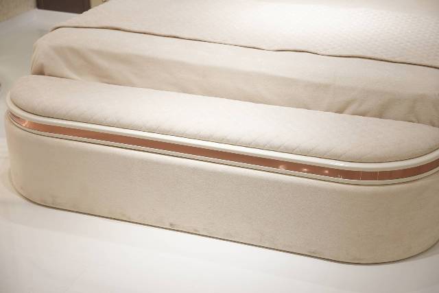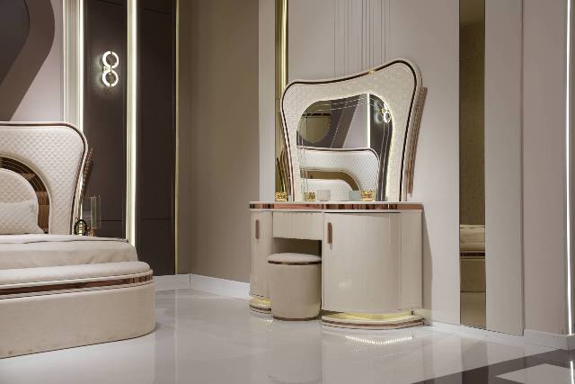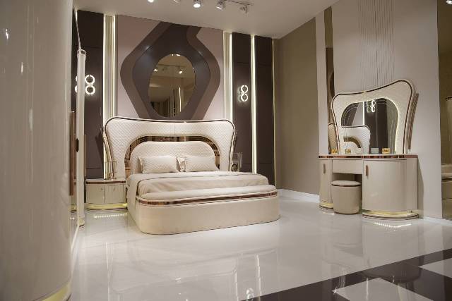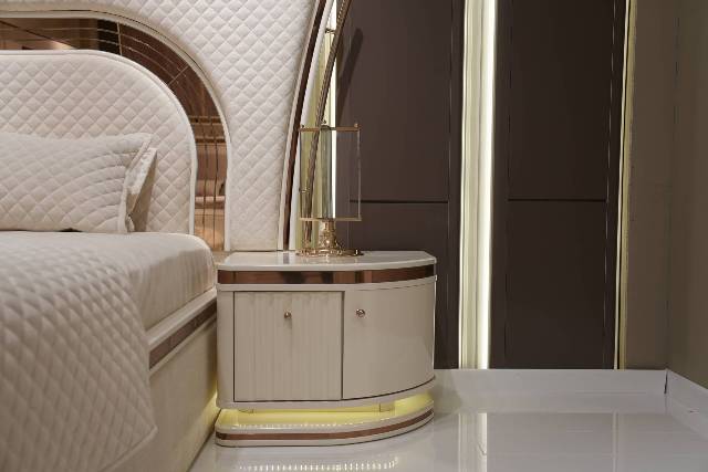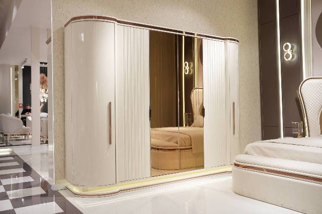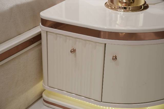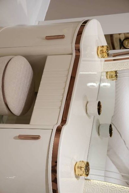 Спальня выполнена в белом цвете из глянцевого МДФ с золотыми декорами на фасадах.