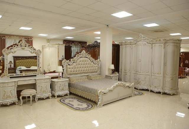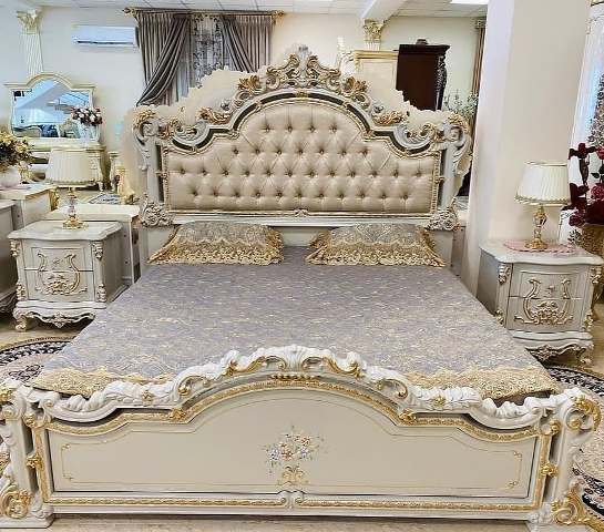 Красивая мебель для спальни Верона 188 с золотой патиной представлена в нашем магазине мебели в Киеве. Спальню можно купить полным комплектом – двухспальная кровать со спальным местом – 1800*2000, 2 тумбочки прикроватные, туалетный столик с зеркалом, пуф, шкаф 6 дверей.