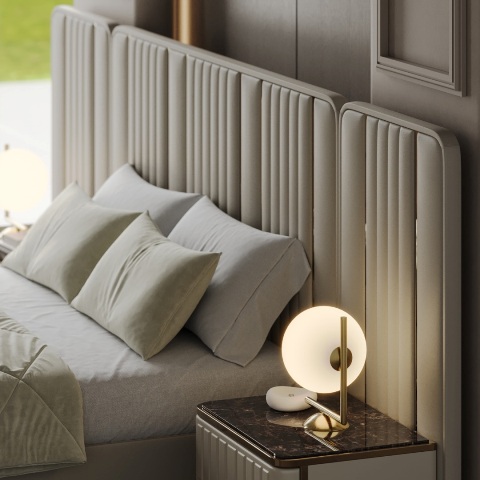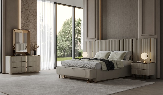 Спальня привлекает своим дизайном – вертикальный резной декор на фасадах мебели краство сочетаются с таким же рисунком на изголовье кровати.