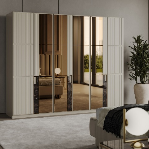 Шестидверный шкаф красиво сочетается с кровать, тумбочками, комодом.