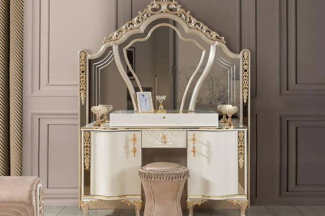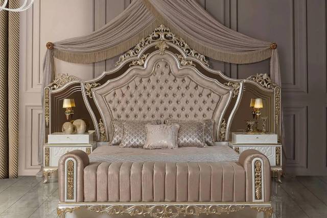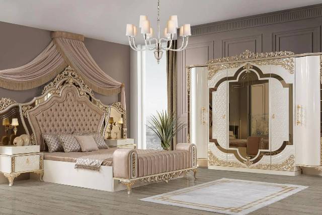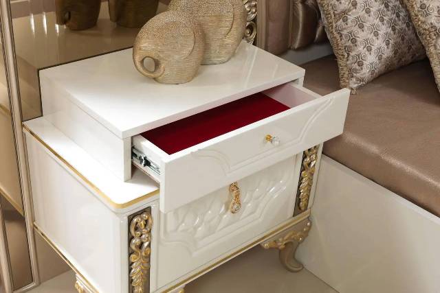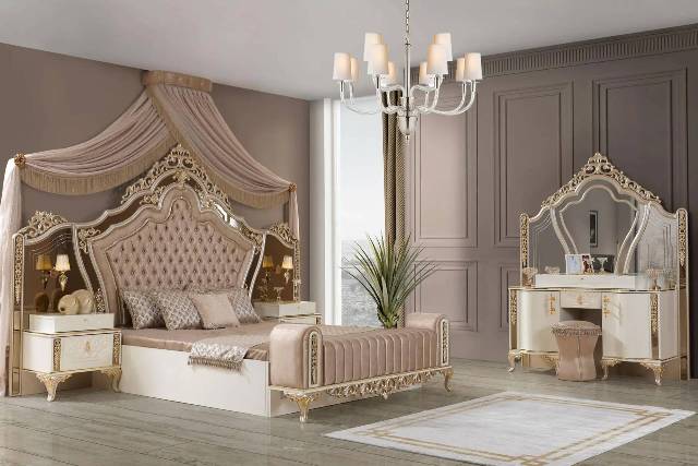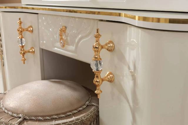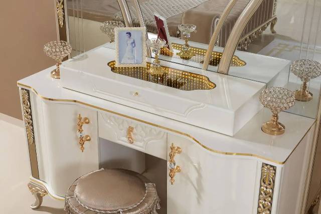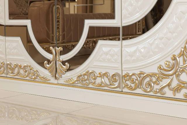 Красивая белая спальня Венеция с золотым декором прекрасный выбор в интерьер Вашей спальни. Спальня выполнена в классическом стиле с элементами барокко. Золотые декоры украшаю каждый элемент мебели в этом комплекте. Спальный гарнитур Венеция выдержана в стиле венецианского фестивале – ярко, стильно, индивидуально. Красивая кровать с большим мягким изголовьем и резными коронами прекрасно подойдет в спальню Вашей мечты.