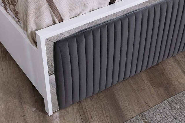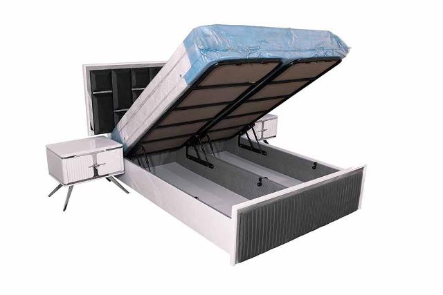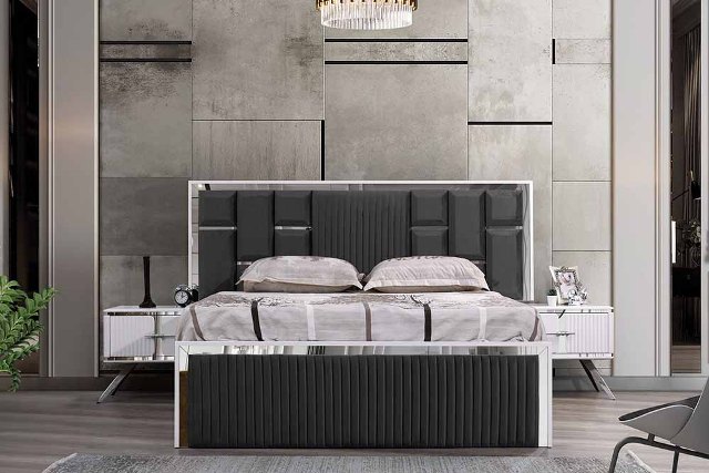 Красивую современную мебель для спальни Ари от турецкой фабрики производителя можно купить в нашем магазине мебели в Киеве. Спальня сделана из МДФ высокого качества с серебренной фурнитурой. Двухспальная кровать оснащена подъемным механизмом и нишей для белья сделана в сером велюре и декором из серебра. Цвет ткани на кровати можно подобрать по каталогу.