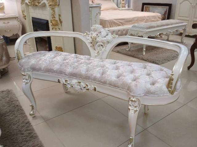 Белая классическая банкетка с патиной Шампань от фабрики Энигма сделана из натурального дерева в белом цвете с патиной белое золото. Такая банкетка будет красиво смотреться в спальне, в прихожей в коридоре в стиле барокко.