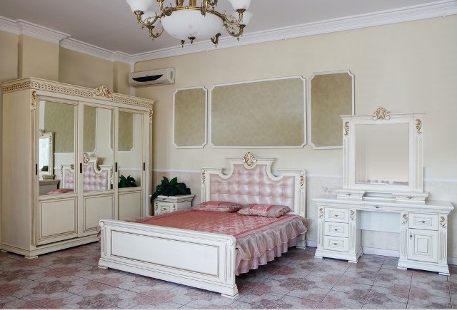 Классическая деревянная мебель для спальни Мария сделана из массива дуба. Цвет спальни Вы сможете выбрать по выкрасам. Ткань или кожу на изголовье по каталогу тканей.