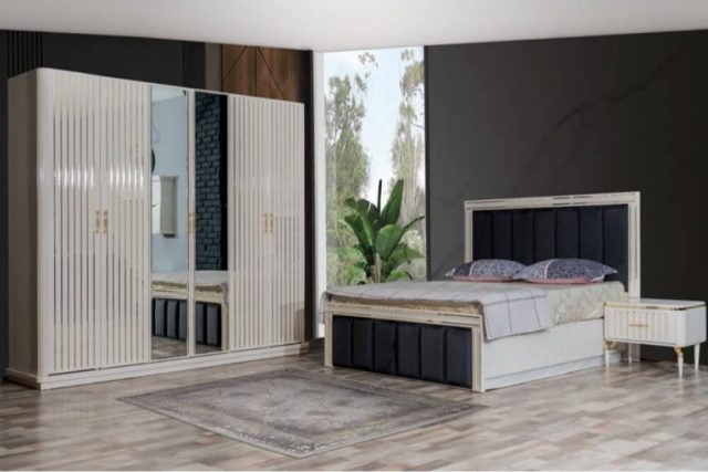 Современная мебель для спальни Инчи в нашем магазине мебели представлена в комплекте-кровать, 2 тумбочки, комод с зеркалом, шкаф распашной. Мебель сделана из белого МДФ и отделана золотым декором.