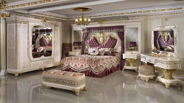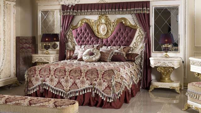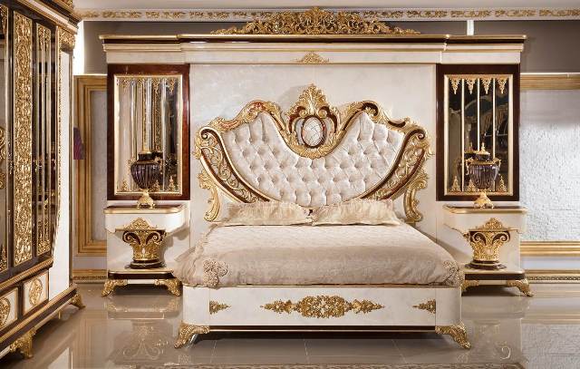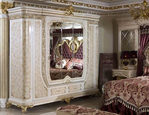 Классическая мебель для спальни Якут представлена в нашем магазине мебели в нескольких коллекциях – в цвете орех, в белом цвете и в комбинированном цвете фасадов. Кровать выполнена с высоким изголовьем в стиле капитоне. Обивку можно подобрать по каталогу тканей. Такая спальня будет украшением Вашей спальни. Спальня выполнена в стиле барокко с золотыми резными узорами на мебели. Большой шкаф имеет много места для хранения. Вы можете заказать полный комплект мебели или заказать кровать и 2 тумбочки.