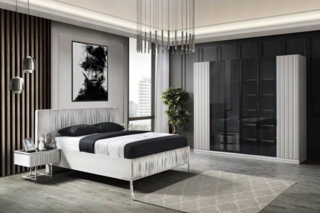 Белая мебель для спальни Сильвер в современном стиле с серебряным декором. Спадбня выполнена из МДФ высокого качества в белом цвете. Кровать оснащена подъемным механизмом и сделана из красивой велюровой ткани. Шкаф можно подобрать по размеру.