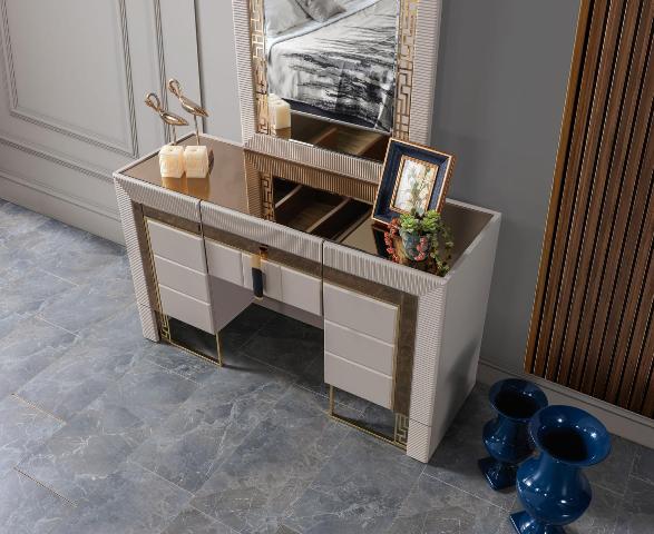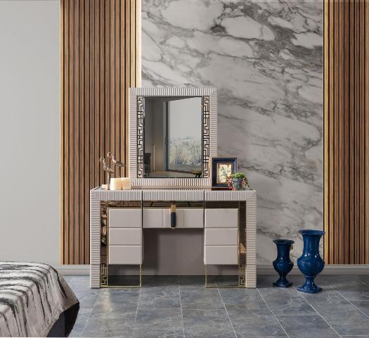 Красивая модель туалетного столика в спальню в стиле АРТ-Деко в Киеве. Туалетный столик Валенсия сделан из МДф и отделан золотом. На фасаде туалетного столика и раме зеркала сделан золотой геометрический декор, что украшает эту модель трюмо. Такой столик красиво смотрится как в комплекте спальни Валенсия так и как самостоятельный элемент мебели.