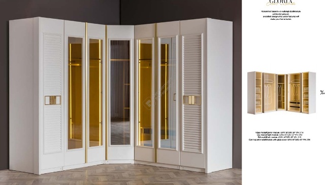 Белый угловой шкаф Глория с золотом