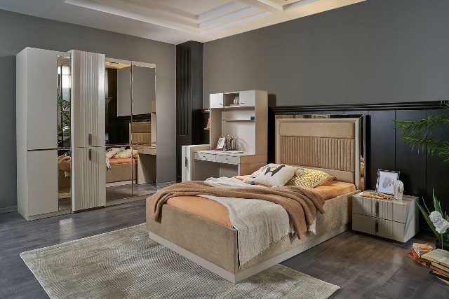 Бежевая мебель в стиле модерн Крем представлена в нашем магазине мебели в Киеве. Красивая и компактная мебель сделана из МДФ высокого качества с зеркальным декором. Такая мебель подойдет и для детей и для подростков.В этой коллекции можно заказать и кровать большего размера 1600*2000 и 1800*2000. Мебель сделана в современном стиле в нежных бежевых тонах. Кровать с мягким изголовьем и золотым декором имеет подъемный механизм.