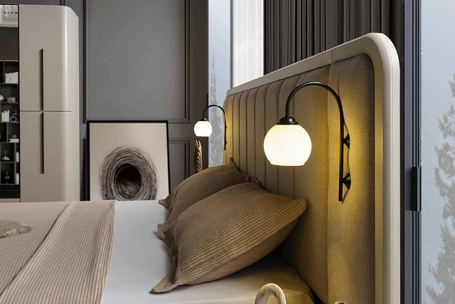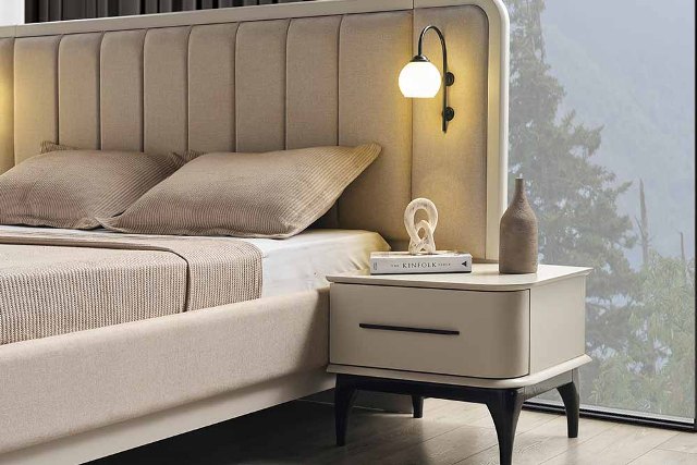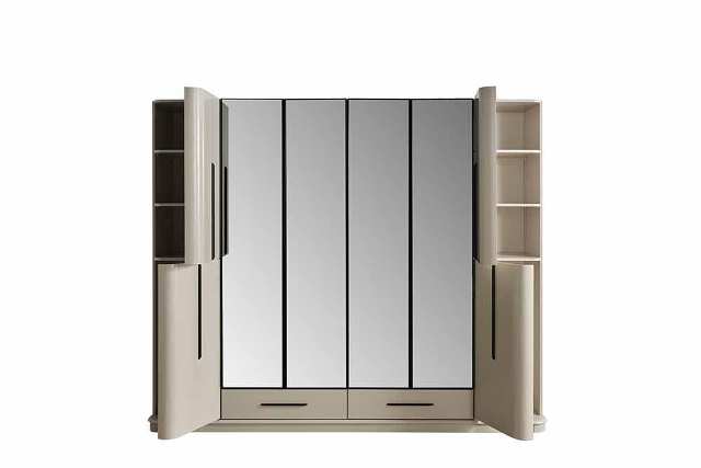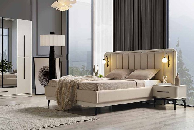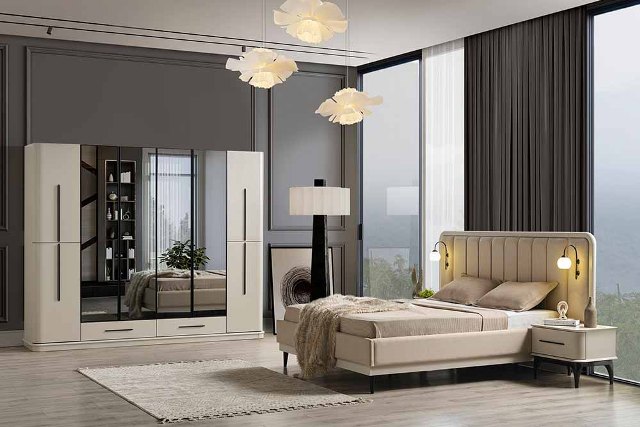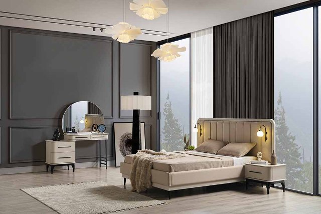 Бежевый комплект мебели для спальни Дестан в нежных натуральных тонах можно купить в нашем магазине мебели в Киеве. В комплект входит – двухспальная кровать с подъемным механизмом, 2 прикроватные тумбочки, туалетный стол с зеркалом и пуфом, шкаф 6 дверей. В этой спальни можно покупать полный комплект или брать отдельными элементами мебели.