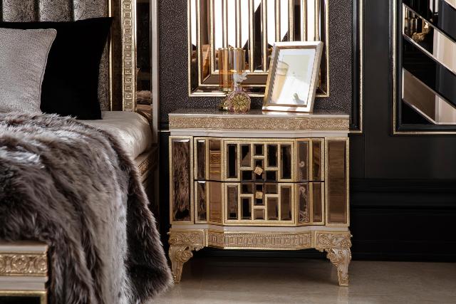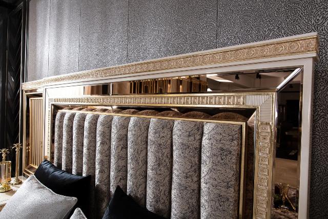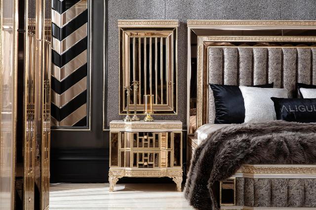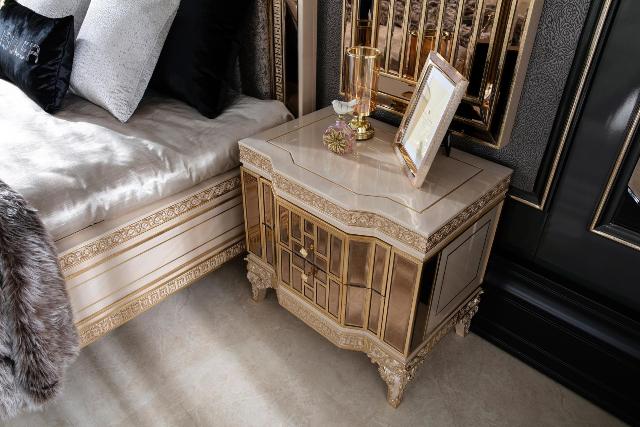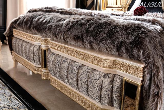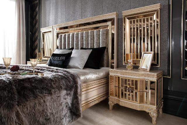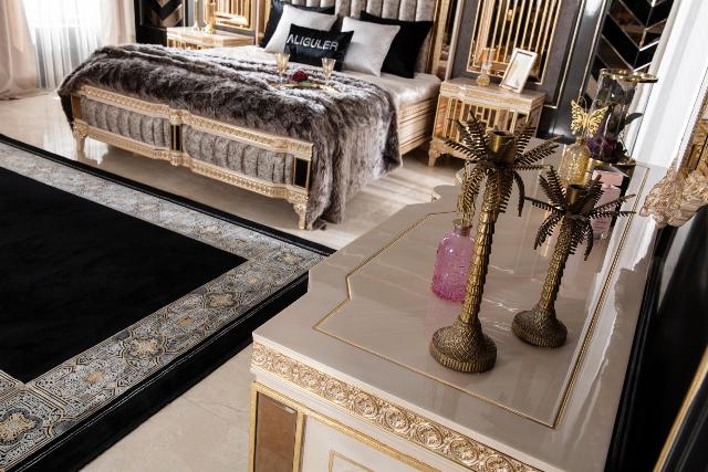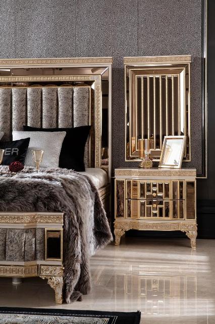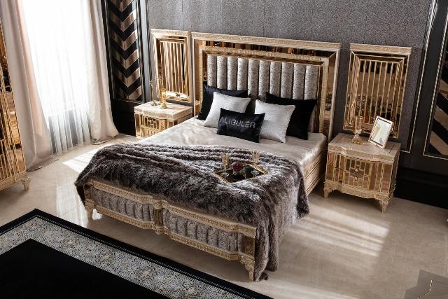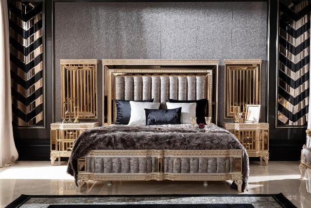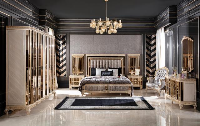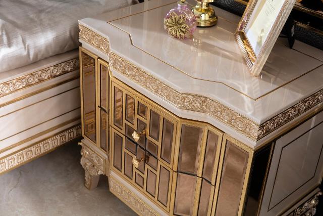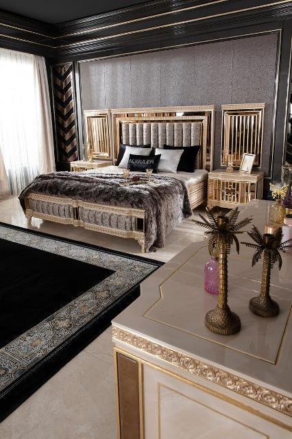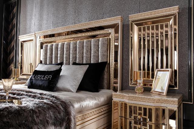 Бежевая спальня с золотой патиной Аматис от турецкой фабрики производителя представлена в нашем магазине мебели в Киеве. Спальтня сделана из дерева и МДФ высокого качества с эффектом глянца. Спальню можно покупать полным комплектом -кровать, тумбочки, комод с зеркалом, шкаф или купить отдельные элементы мебели. Ткань на изголовье можно выбрать по каталогу тканей.