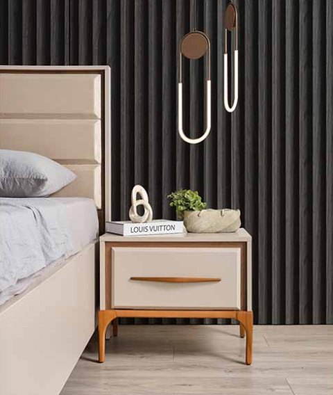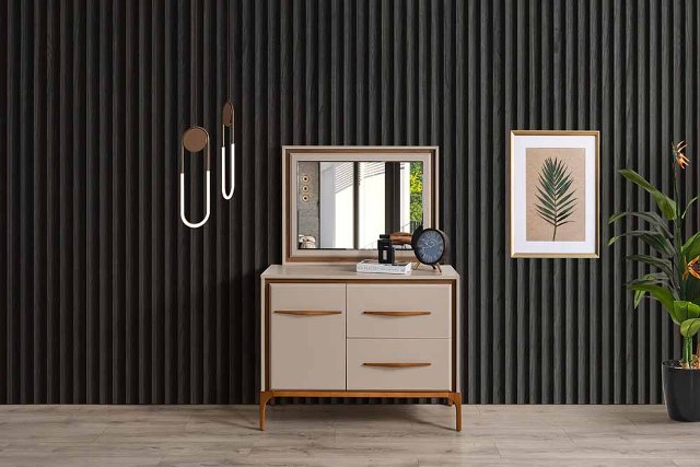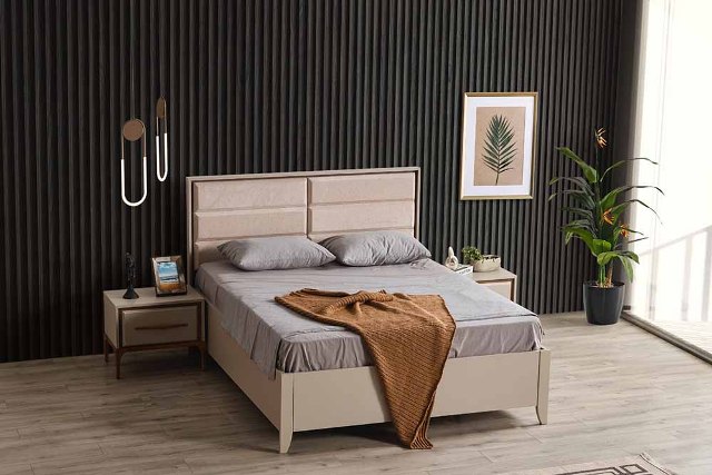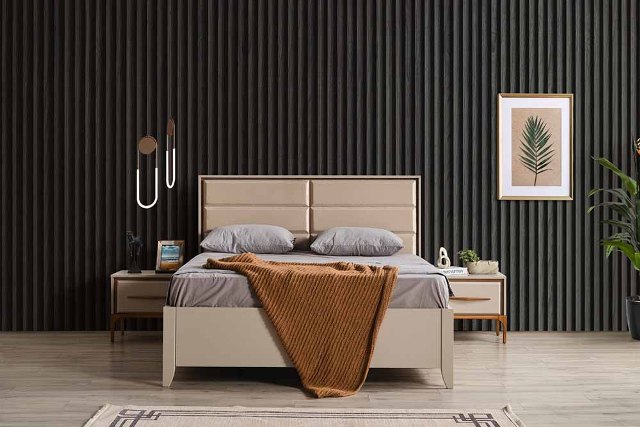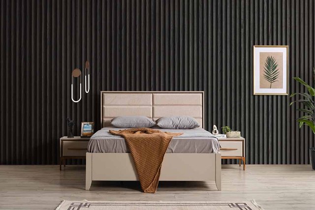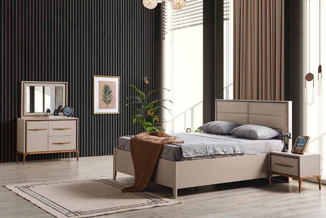 Бежевый комплект мебели из МДФ Кумсал можно заказать и купить в нашем магазине мебели в Киеве. Спальня сделана в современном стиле на турецкой фабрики. В комплект мебели входит- кровать 1600/2000, 2 тумбочки, комод с зеркалом, шкаф 6 дверей.