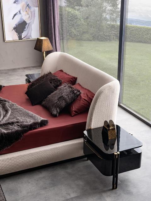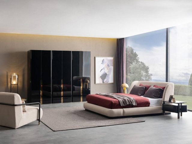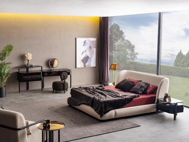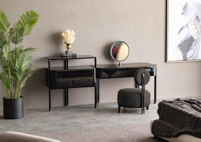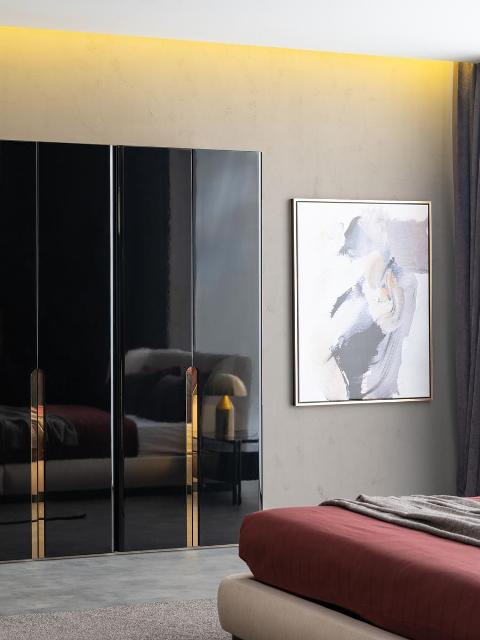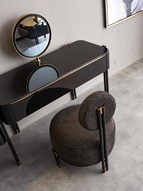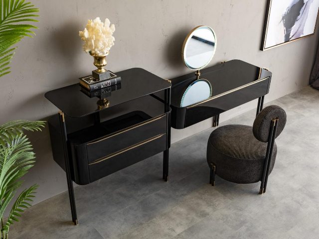 Современная мебель для спальни Дарк выполнена из черного глянцевого МДФ с золотым декором на фасадах. В комплект спальни входит – мягкая двухспальная кровать, прикроватные тумбочки, дизайнерский туалетный столик, распашной шкаф.