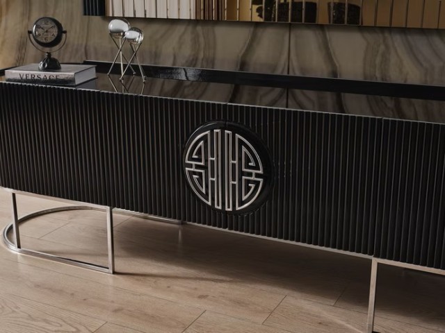 Современная тумба под телевизор с элементами стиля АРТ-Деко. ТВ тумба Гуччи от турецкой фабрики производителя выполнена из современных материалов – МДФ, метала, стекла. Тумбу можна заказать в нашем магазине мебели в Киеве с доставкой по всей Украине.
