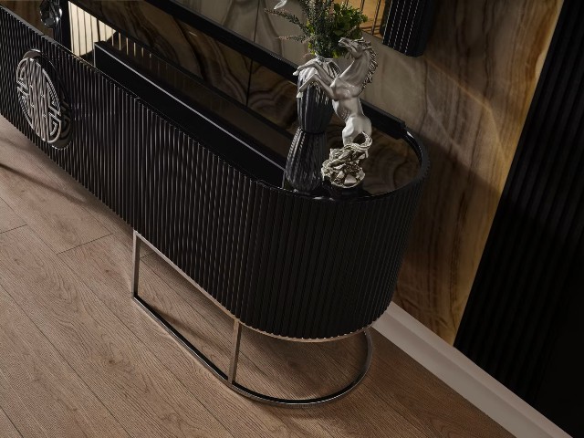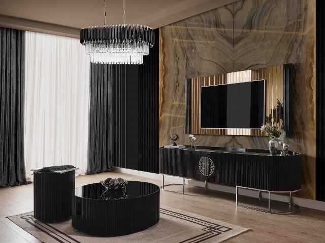 ТВ тумба интересна своим дизайном и может быть выполнена в таких цветах – белый, серый, бежевый,черный. Фурнитура – золото, серебро.