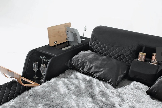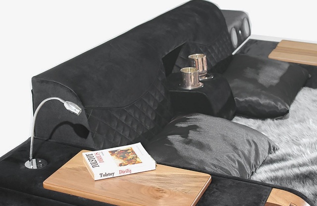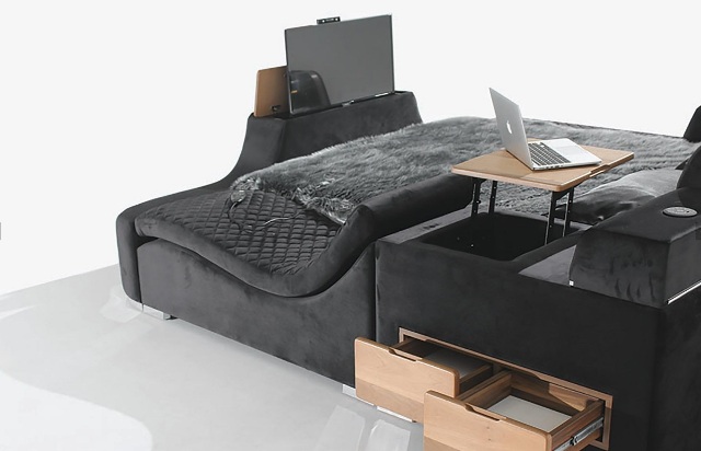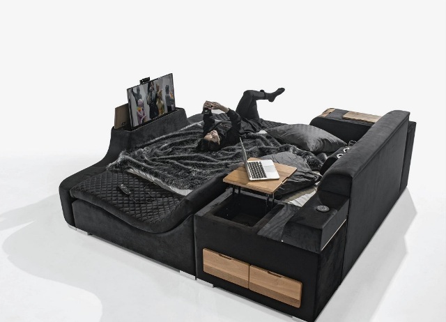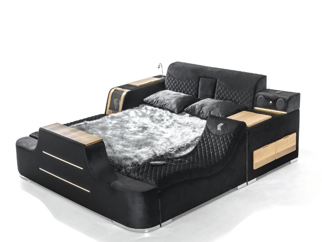 Турецкая умная кровать в размере 1600/2000 ( 250*265*94) и 1800/2000 (( 270*265*94)) изготовлена из дерева, МДФ и велюровой ткани. В комплектацию входят все нижеперечисленные позиции. телевизор в комплект не входит и докупается отдельно. Кровать можно выполнить в любой цветовой гамме. Цена за кровать указана в ткани. Ткани можно подобрать по каталогу – велюр, антикоготь, антиклин.