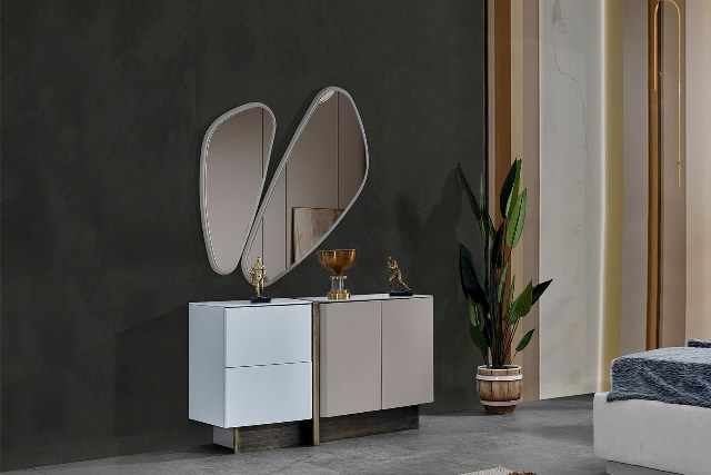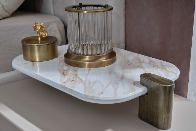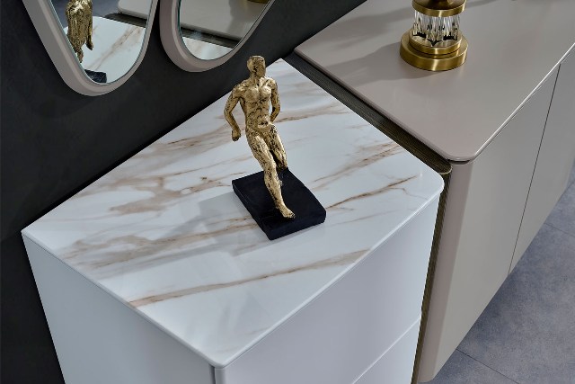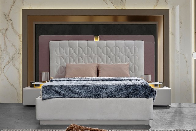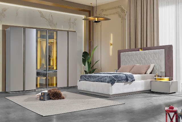 Красивая современная мебель для спальни Дафна. Спальня сделана из МДФ высокого качества в светлых цветах. Прямые формы мебели декорированы интересными деталями фурнитуры и столешницами на комоде и тумбочками под мрамор. Шкаф интересен тем, что он состоит из двухдверных модулей с закрытыми фасадами и со стеклом. Мягкая кровать может быть в двух размерах – 1600*2000 и 1800*2000 и оснащена подъемным механизмом.