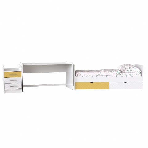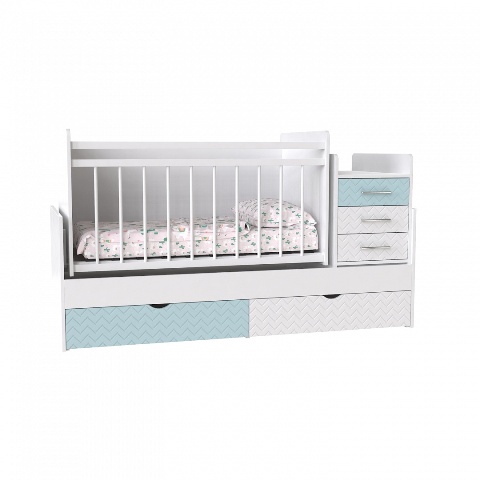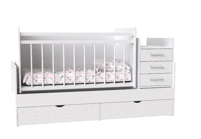 Детская кроватка-трансформер Аляска в нашем магазине мебели в Киеве представлена в белом цвете. Кровать детская Аляска сделана из 3 -х единиц мебели – люлька, комод для белья, пеленальный столик и может сталь полноценной односпальной кроватью и письменным столом.