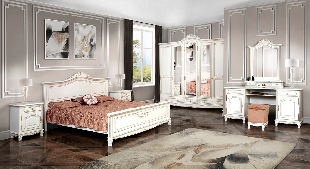 Белая классическая мебель для спальни Элипс от румынской фабрики SIMEX. В этой коллекции мебели для спальни есть кровати с мягким и с твердым изголовьем в размере 1600*2000 и 1800*2000. Спальня выполнена из массива натурального дерева в цвете орех и в белом. На светлую спальню можно нанести патину -золото и серебро.