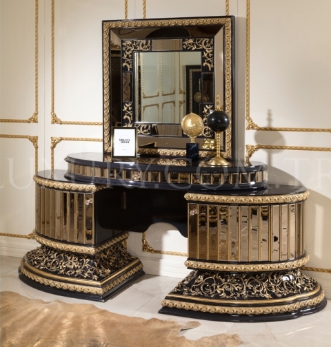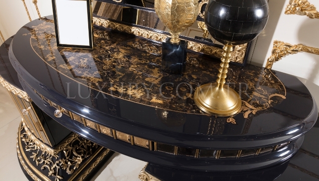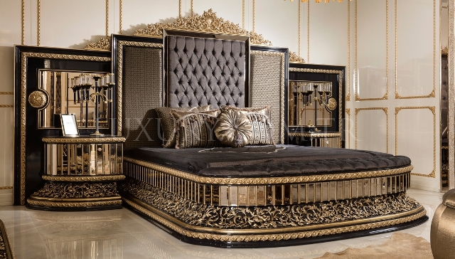 Элитная черная спальня Геракл из массива натурального дерева и МДФ высокого качества. Спальня Геракс сделана в стиле барокко сочетая в себе черный и золотые цвета. Такая королевская спальня подойдет больше в мужскую спальню так как всем своим видом подчеркивает силу и величие. Кровать Геракл с высоким королевским изголовьем красиво сочетается с прикроватными тумбочками создавая законченное спальное место. Такой ансамбль мебели создаст уют и красоты в Вашем доме.