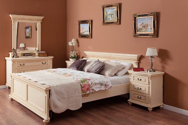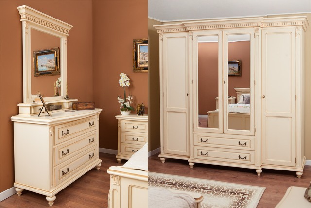 Деревянная спальня Франческа от румынской фабрики производителя Вы сможете купить в Киеве в нашем магазине мебели. Мебель сделана из натурального дерева в светлом цвете. Так же эту коллекцию мебели можно заказать в цвете орех, крем, белый с золотой патиной.