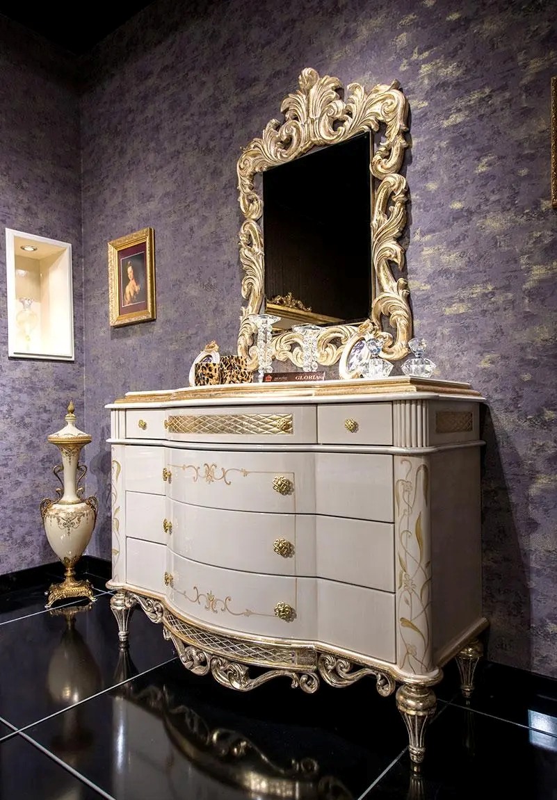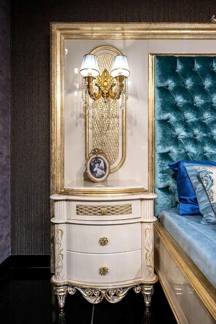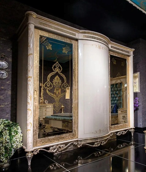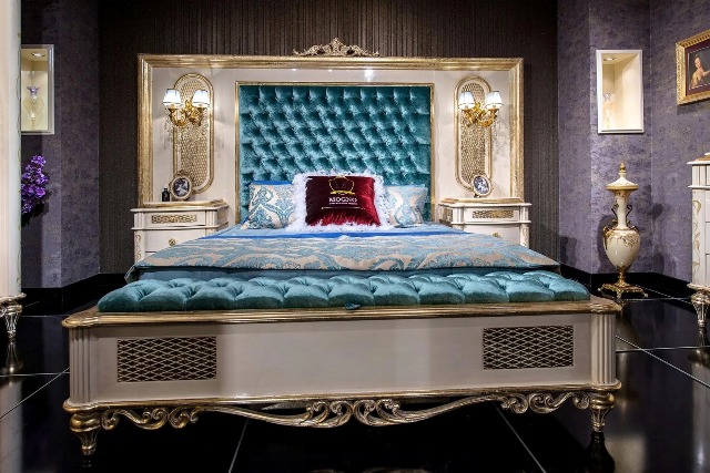 Белая классическая спальня Глория от турецкой фабрики производителя. Спальня выполнена в королевском стиле с большим изголовьем с золотой короной. Можно купить кровать с тумбочками или заказать полный комплект- кровать, 2 тумбочки, комод с зеркалом, шкаф 6 дверей.