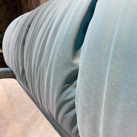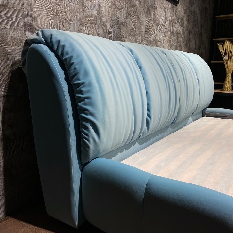 Красивая современная мягкая кровать Лагуна L 055 с делана из натурального дерева и красивой велюровой ткани в голубом цвете. Нужный цвет ткани можно подобрать по каталогу тканей.