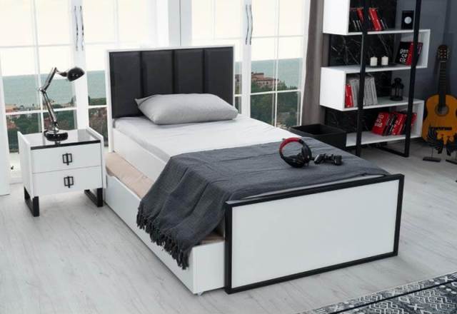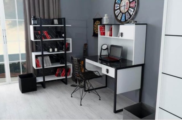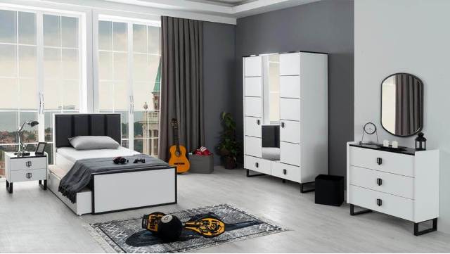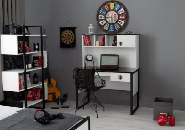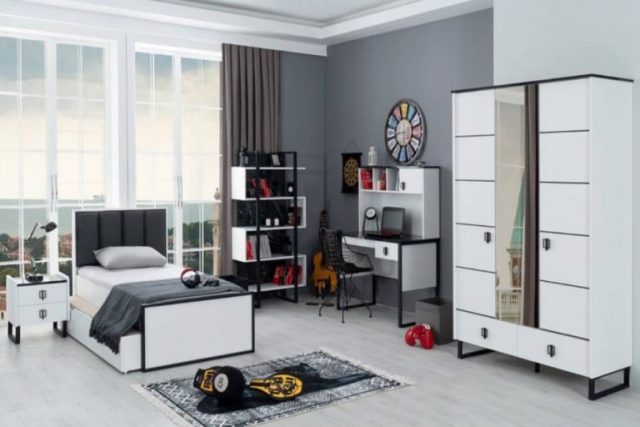 Современный комплект модульной мебели Гранит для детской комнаты из высококачественного МДФ сделан в комбинации белого и черного цвета.