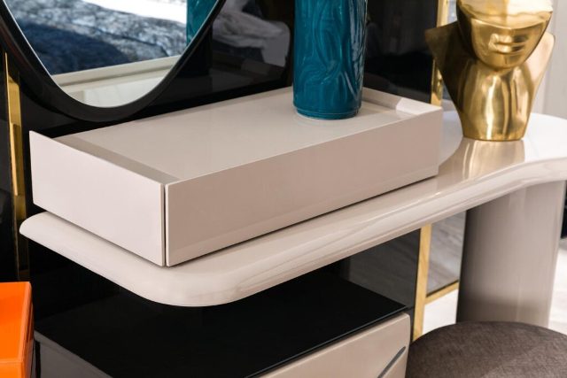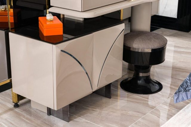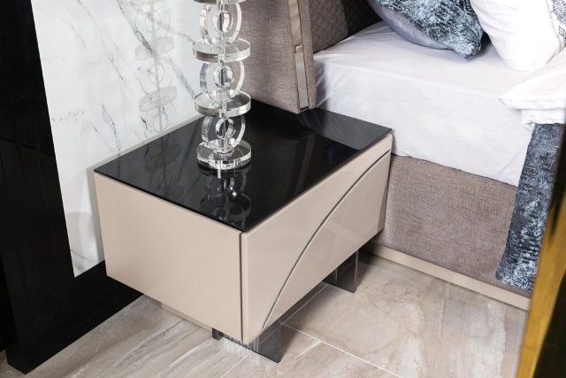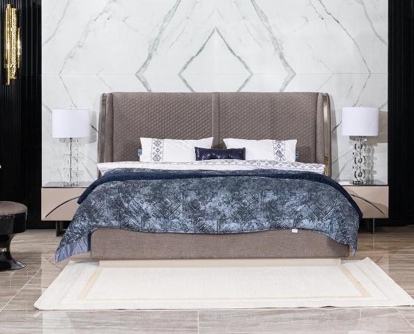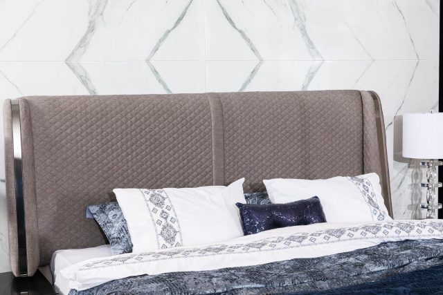 Красивая современная мебель для спальни в цвете латте. Двухспальная мягкая кровать прошита ромбовидными узорами на изголовье с отделкой из метала, что делает эту кровать эксклюзивной. Такая кровать будет смотреться интересно как самостоятельный элемент мебели в интерьере так и в полном комплекте спальни.