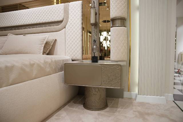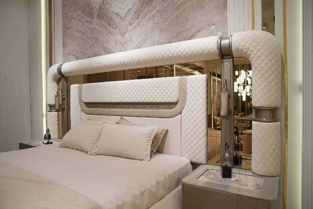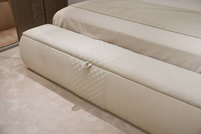 Спальня Аспендос выполнена в современном стиле с элементами АРТ-Деко. Большая двухспальная кровать сделана в белой мягкой ткани с ромбовидным рисунком. Большое изголовье кровати декарировано красивым зеркальным панно, что придает элегантности этой кровати в любом интерьере. С двух сторон вмонтированы хрустальные бра, что делают эту спальню не только красивой, но и практичной. Бра функуиональные и дают нежный, теплый свет в комнате делая подготовку ко сну комфортнее и уютнее. Изножье кровати сделано в виде красивой, мягкой ниши для хранения белья которая выполняет функцию банкетки.
