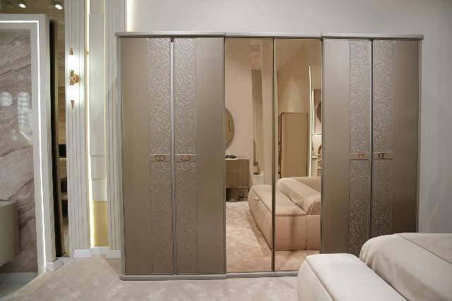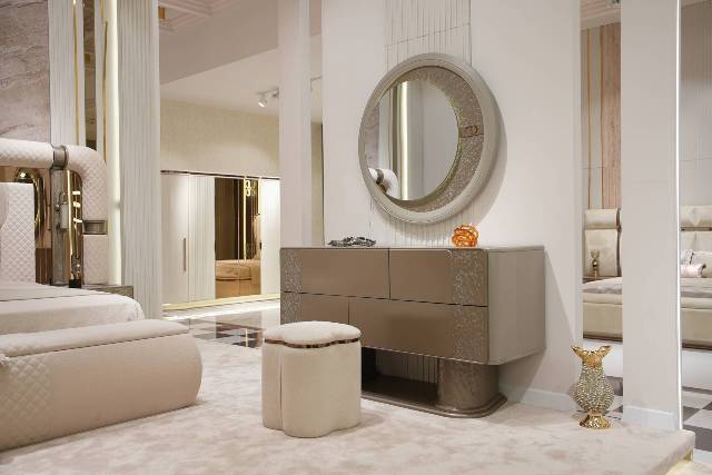 Тумбочки, трюмо ( комод) с зеркалом и шкаф выполнены из высококачесвенного МДФ в цвете мокко с декоративным тиснением на фасадах, что в сочетании с белой кроватью делает коллекцию спальни Аспендос оригинальной и экслюзивной.