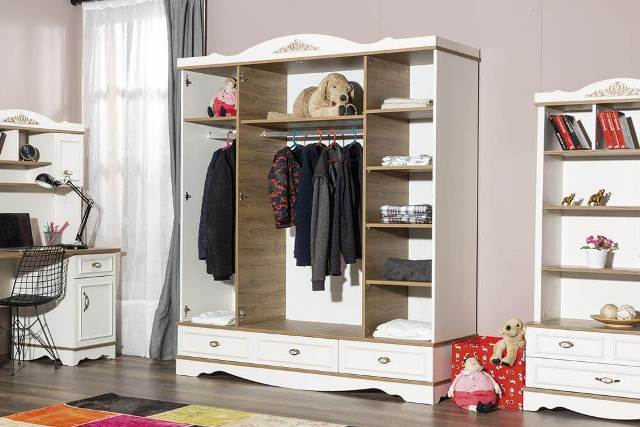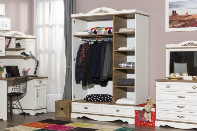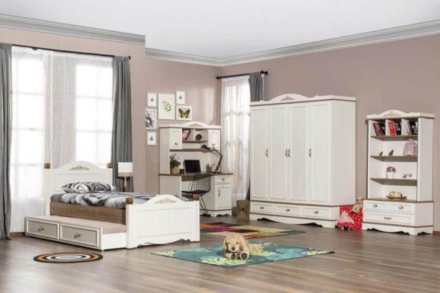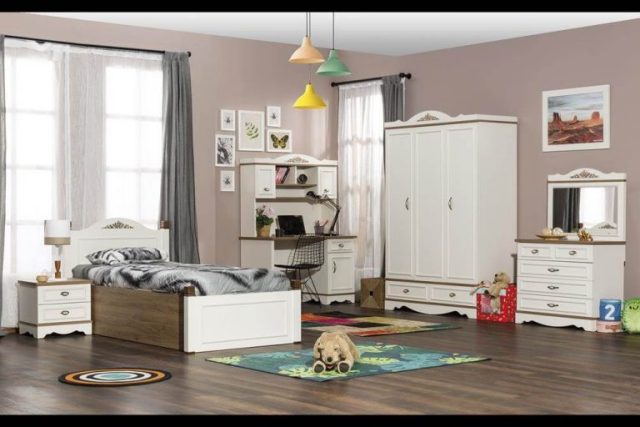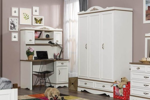 Красивая мебель для спальни в нежном белом цвете Кантри с цветочными отделками прекрасно украсит детскую комнату для Вашей девочки. Спальня выполнена в классическом стиле и в комплект мебели Кантри входят все необходимые элементы мебели для детской комнаты- кровать, тумбочки прикроватные, этажерка, письменный стол, шкаф для одежды.