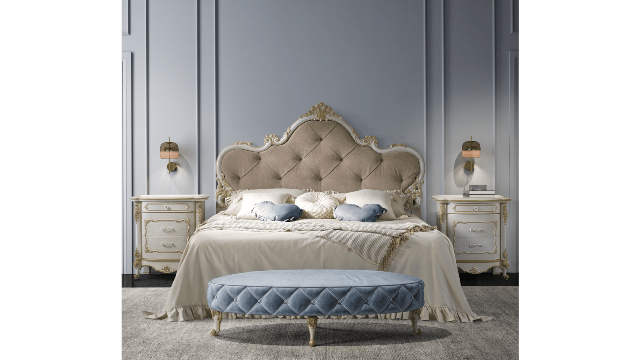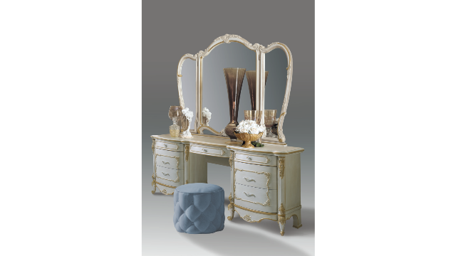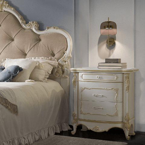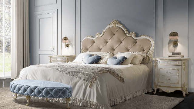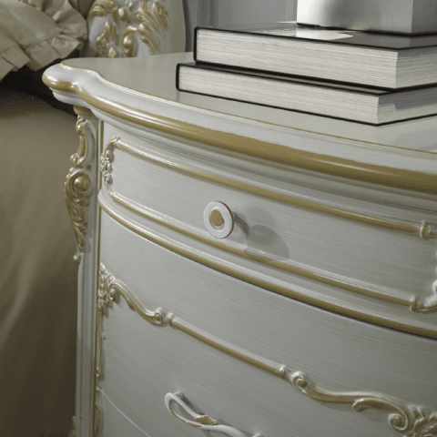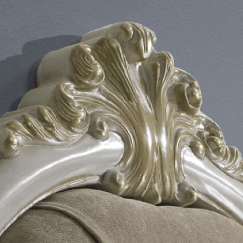 Классическая красивая мебель в спальню Марекьяро от известной итальянской фабрики производителя мебели Ghezzani. Мебель сделана из натурального дерева в белом цвете с золотой патиной. Аккуратное резное изголовье обито дорогой велюровой тканью в стиле капитоне. Кровать Марекьяро сделана без изножья, что дает возможность устанавливать ее в небольших спальнях.