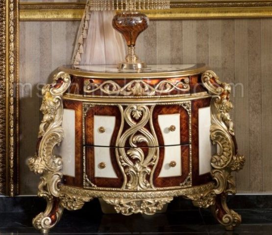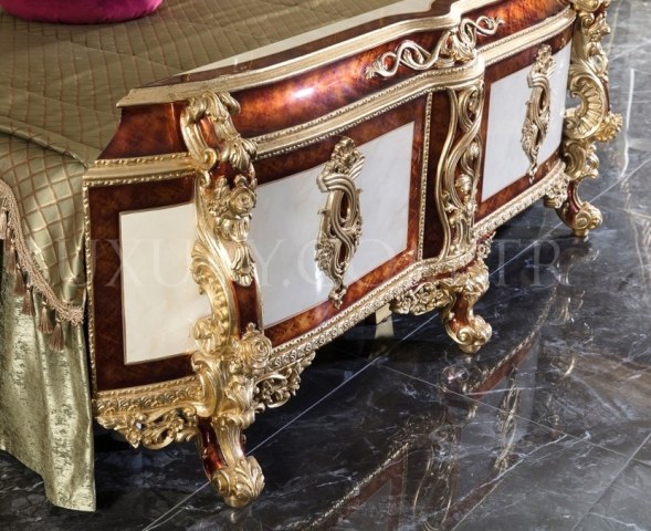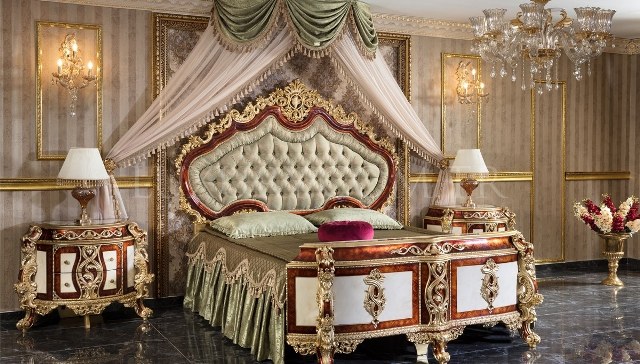 Резная мебель для спальни Рива сделана из массива натурального дерева в стиле классика, барокко. Эта мебель красиво украсит интерьер Вашей спальни в стиле барокко. Все резные части сделаны с золотом, что делает эту мебель королевской.