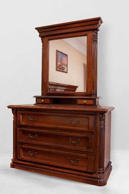 Классический румынский комод для белья в спальню София Люкс сделан из натурального дерева в цвете орех. По желанию клиента можно сделать в светлом цвете с нанесением патины -золото, серебро. Комод можно покупать с зеркалом или без зеркала. Можно купить отдельно от комплекта спальни или вместе со спальней София Люкс. Такой комод будет актуально смотреться как в гостиной, спальне так и в прихожей.