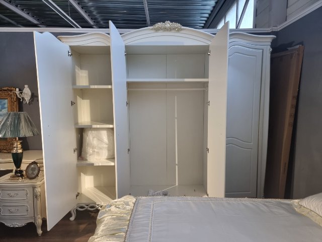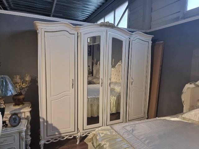Распашной белый шкаф с зеркалами в классическом стиле с патиной представлен в нашем магазине мебели в Киеве. шкаф выполнен из натурального дерева и МДФ с патиной из белого золота ( шампань). По желанию клиента можно сделать патину золото.