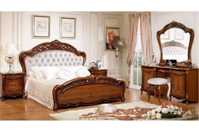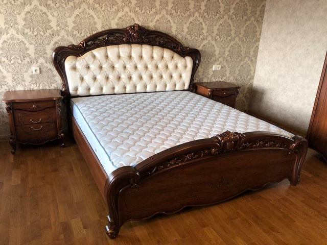 Классический комплект мебели для спальни Дженифер в цвете орех Вы можете купить в нашем магазине мебели в Киеве. Мебель сделана из МДФ высокого качества в стиле классика. Красивая двухспальная кровать сделана с мягким изголовьем и резным декором на изголовье и изножье. На фасадах мебели сделаны красивые резные узоры. Большой шкаф имеет много места для хранения.