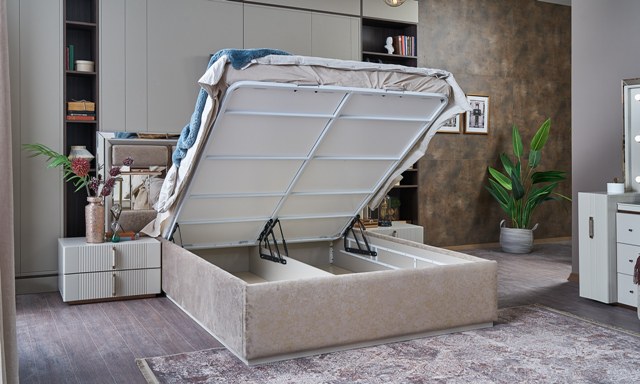 Кровать оснащена подъемным механизмом и нишей для белья.